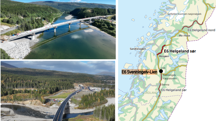 Åpnet siste del av E6 Helgeland Samferdselsminister Jon Ivar Nygård åpnet i dag ny E6 Svenningelv-Lien.Den nye trafikksikre delen av E6 er 10,3 kilometer lang, har 8,5 meters bredde ...